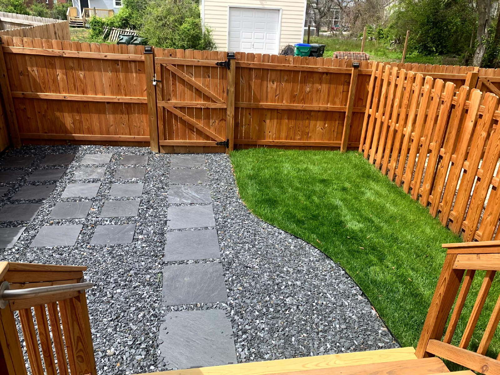 Fenced backyard with patio